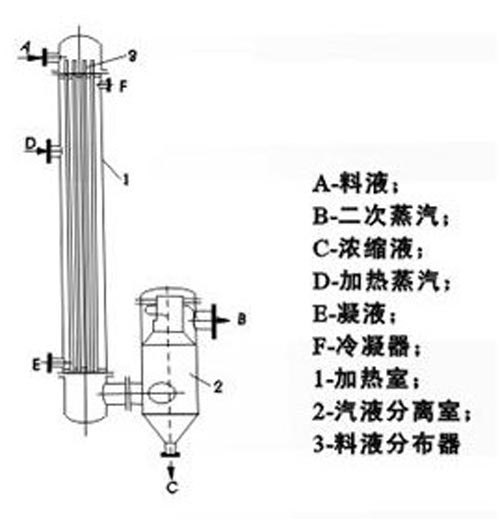 此種蒸發(fā)器是一種單程型高效蒸發(fā)器。利用液體分布器將物料均勻地分布在加熱管內(nèi)壁上,然后沿管子內(nèi)壁成膜狀流動(dòng),在流動(dòng)的過程中物料被加熱蒸發(fā)。二次蒸汽聚集在管子中央,在分離室負(fù)壓及重力的抽吸作用下向下運(yùn)動(dòng),進(jìn)一步拉動(dòng)液膜向下流動(dòng),因此液膜的流動(dòng)速度較快,液膜與加熱管的熱阻小,傳熱系數(shù)高。所以管式降膜蒸發(fā)器可以作多效作業(yè),只要很小的溫度差(6~8℃),就能正常工作�?筛鶕�(jù)蒸發(fā)物料性質(zhì)及蒸發(fā)目標(biāo)不同,組合成雙效、三效、四效、五效和六效蒸發(fā)系統(tǒng)。